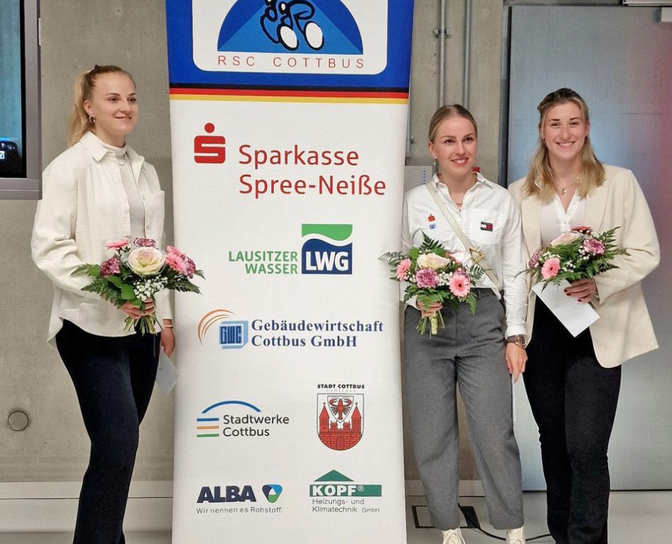 Einen überaus herzlichen Empfang gab es Anfang November für Sportler*innen des RSC Cott bus, die erfolgreich an den kürzlich statt gefundenenWeltmeisterschaft en im Bahnradsport teilgenommen hatt en. Allein die drei Sportlerinnen Lea Sophie Friedrich, Emma Hinze und Pauline Grabosch brachten 4 xGold, 2 x Silber und 1 x Bronze aus Paris mit und gehörten damit zu den erfolgreichsten Sportlern bei diesem Ereignis. Dafür erhielten sie die herzlichstenGlückwünsche von Vertretern der Stadt, des Vereins und natürlich auch von den Sponsoren, zu denen auch die LWG gehört.