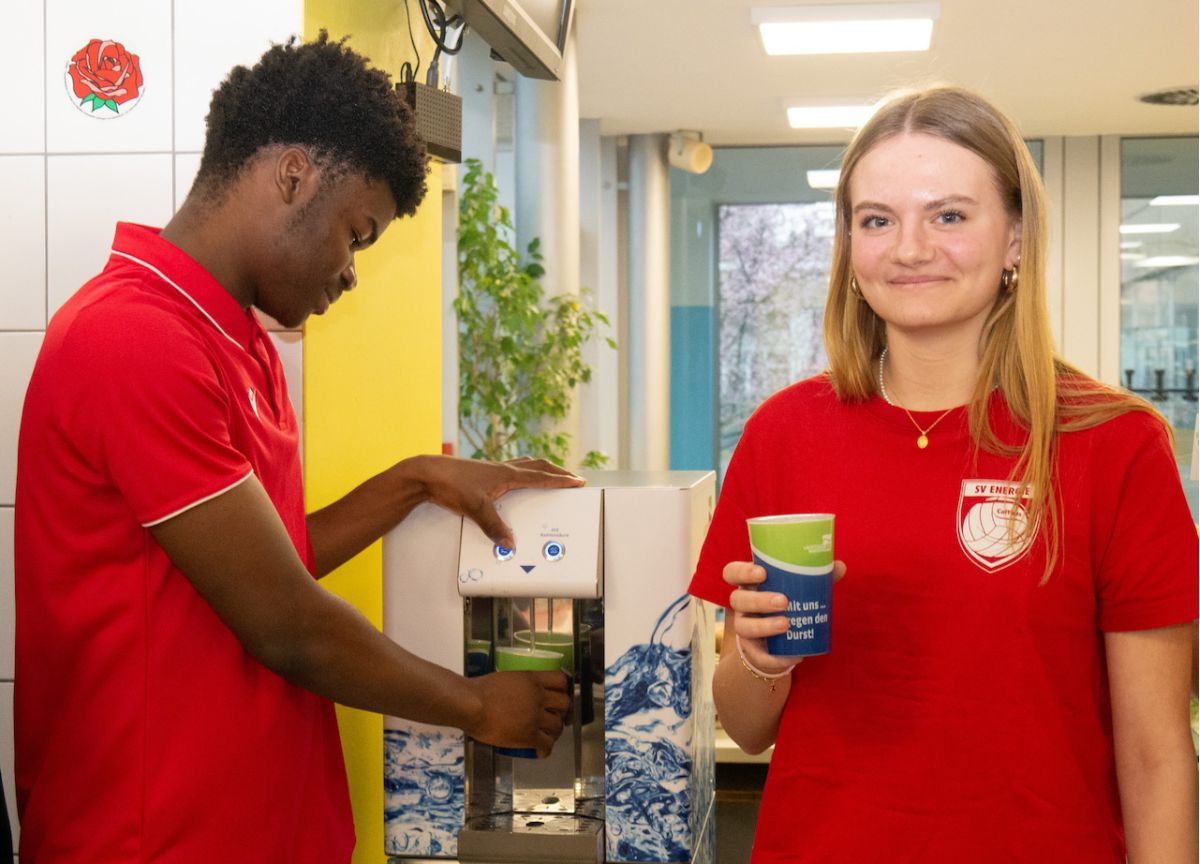 Die Volleyballerin Henriette Fleischer und der Fußballer Steeve Rayan Mabel gehören zu den Ersten, die den neuen Spender nutzen. Regelmäßiges Wassertrinken ist hier nun eine Leichtigkeit und „das ist gut so, denn es ist besonders wichtig für unsere sportlichen Bestleistungen und unser allgemeines Wohlbefinden“, so die beiden jungen Talente.