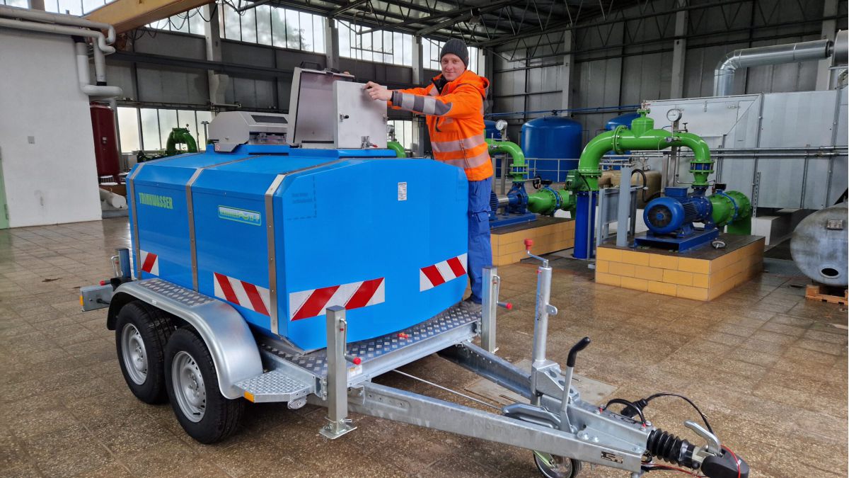 Die LWG hat in Kooperation mit der Stadt Cottbus einen von zwei neuen Trinkwasserwagen in Betrieb genommen. Der neue Wasserwagen, ausgestattet mit einem 2.300-Liter-Tank und einer leistungsfähigen Pumpe – im Bild Christian Scheppan beim Check –, ermöglicht die sichere und flexible Versorgung der 15 Katastrophenschutzleuchttürme mit Trinkwasser, selbst wenn die leitungsgebundene Wasserversorgung ausfallen sollte.