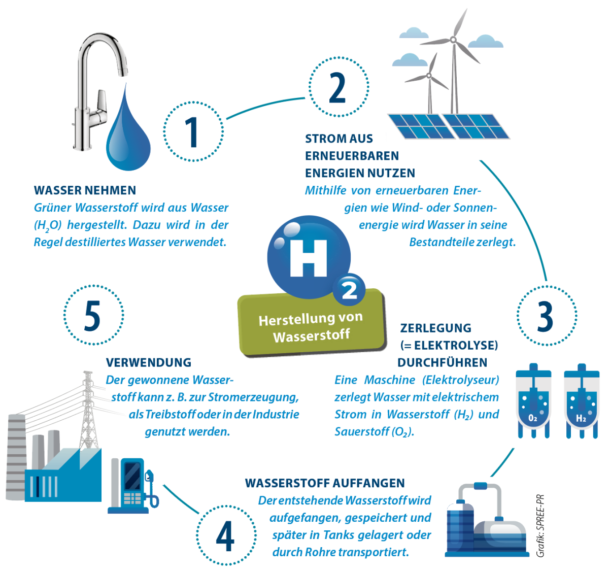 Es gibt verschiedene Herstellungsmöglichkeiten von Wasserstoff. Hier wird vereinfacht das Verfahren der Elektrolyse dargestellt. Werden dabei erneuerbare Energien verwendet, handelt es sich um „grünen“ Wasserstoff. Die Produktion hinterlässt keine umweltschädlichen Nebenprodukte, ist aber energieintensiv.