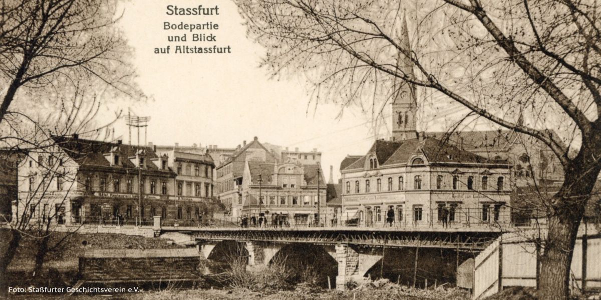 Inzwischen hat Staßfurt natürlich mehrere Brücken, die das Stadtzentrum mit dem historischen Ursprung des Ortes, dem Stadtteil Alt-Staßfurt, verbinden. „Von hier aus hätte man vor rund 100 Jahren noch tolle Fotos machen können“, sagt Schäfer mit Bedauern in der Stimme und zeigt auf die Gebäude rund um die Bodebrücke an der Lehrter Straße. Ein paar historische Überbleibsel, wie etwa das schwarze Pferd auf dem ehemaligen Gasthaus „Schwarzes Ross“ oder das Staßfurter Landhaus sowie der derzeit in Sanierung befindliche Turm der St. Marienkirche, gibt es natürlich immer noch. Aber andere historische Gebäude sind inzwischen verfallen. Die ehemalige „Engländer-Fabrik“ ist 1902 sogar abgebrannt.