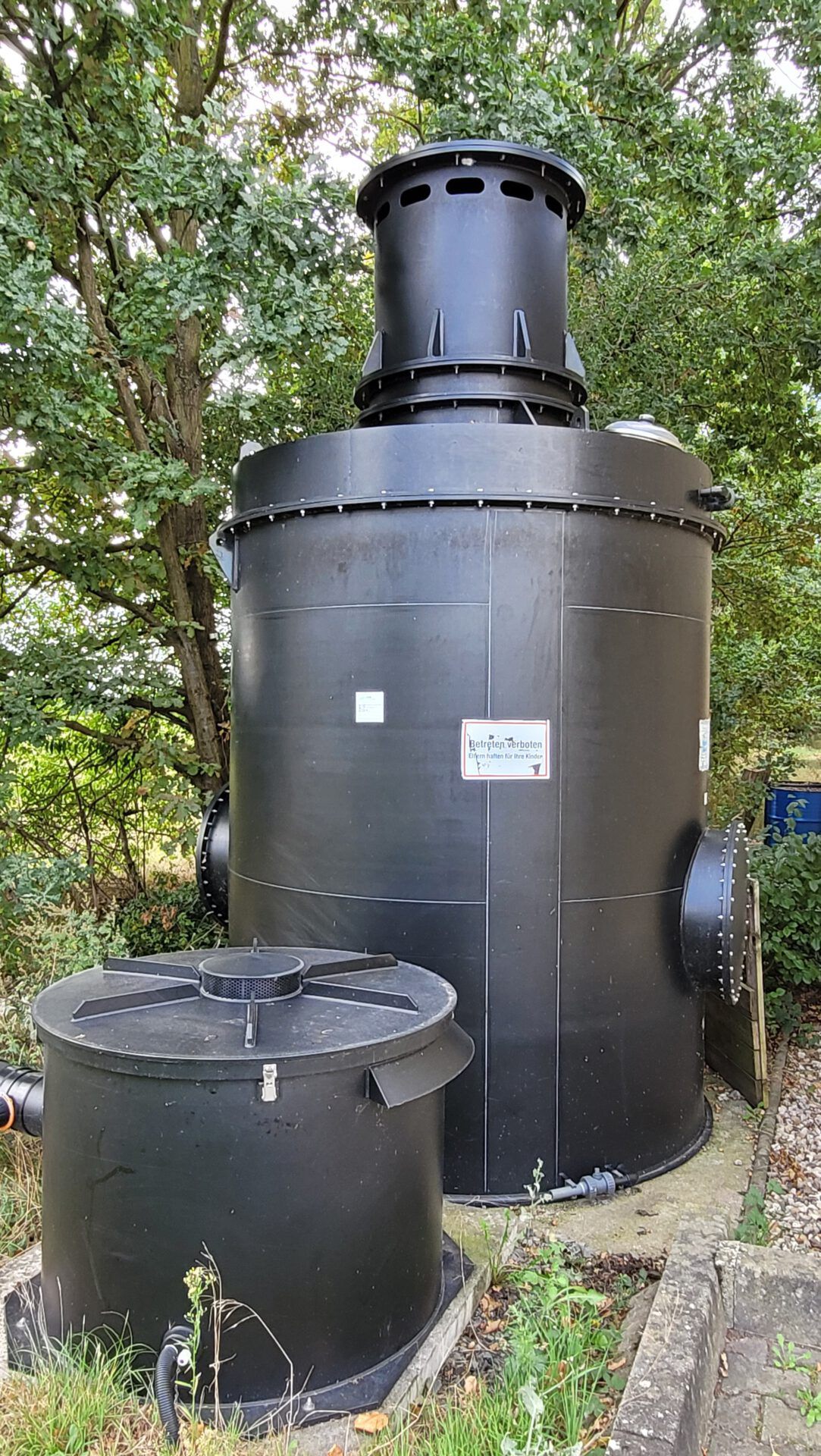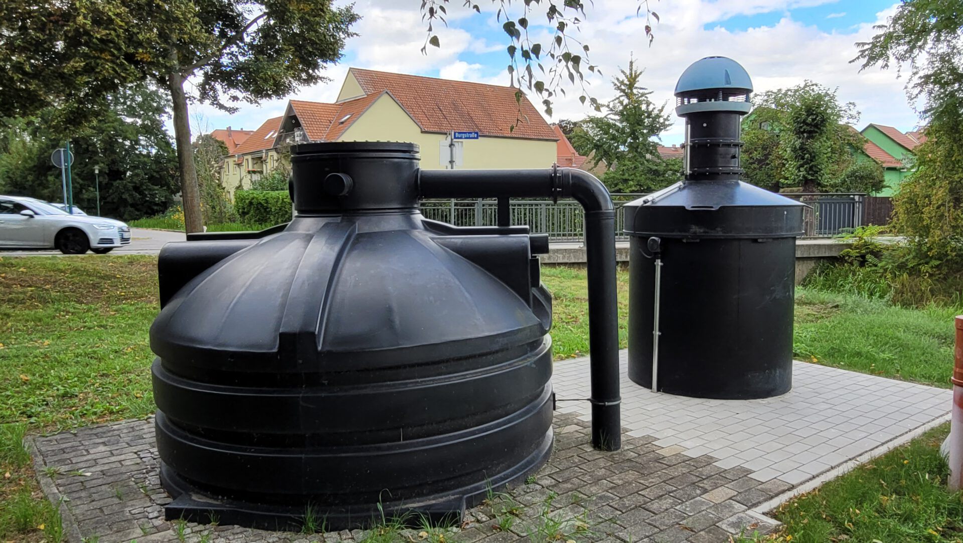 Auch hier saugt ein Bio-Abluftfilter Schwefelwasserstoffgeruch aus dem Kanal.