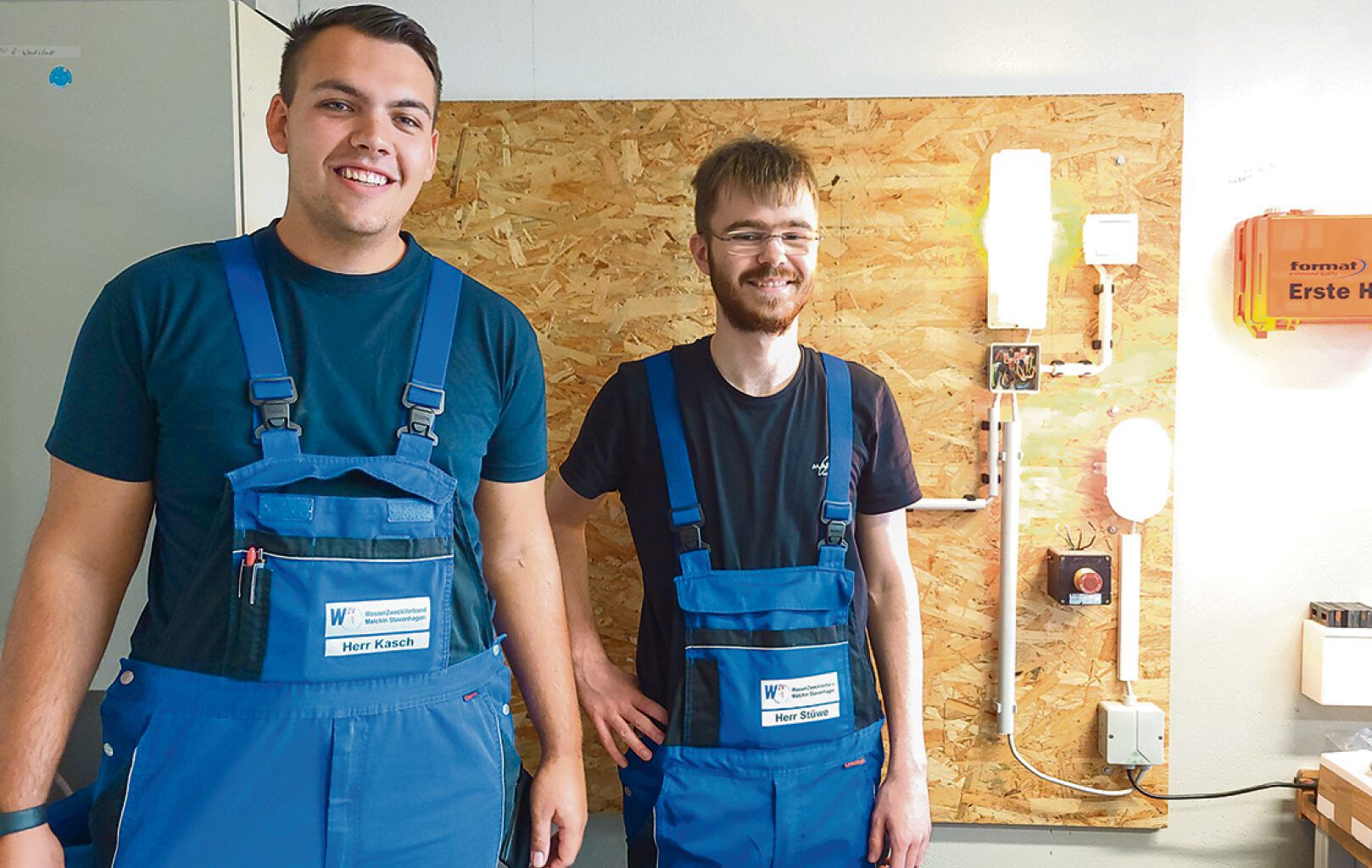 Nach mehreren Praktika beim Verband stand für Martin Stüwe (r.) fest: Er möchte Elektroniker für Betriebstechnik werden. Ex-Azubi Brian Kasch steht ihm mit Rat und Tat zur Seite.