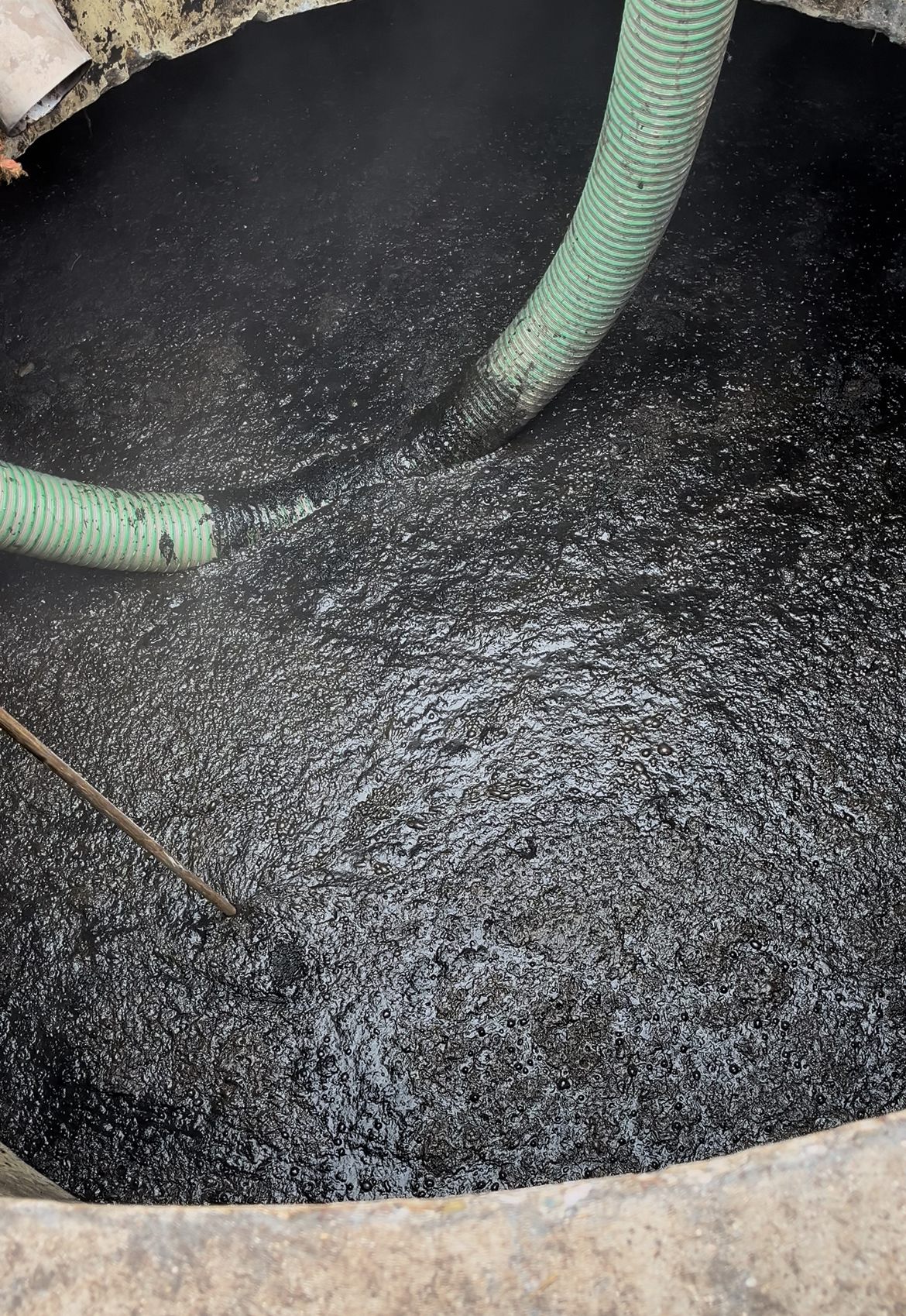 Bloß kein Stillstand: Bei der Reini­gung des Faulturms im Herbst 2025 wurde die Schlammdecke mit einer Hochdruckdüse mit über 1.000 bar zersetzt und durch ein leistungsstarkes Saugfahrzeug entfernt. Das Material wurde in Absetzcontainern entwässert und anschließend entsorgt. Die Maßnahme trägt zur optimalen Funktion und Langlebigkeit der Anlage bei. Auf den beiden Fotos sind die Öffnung des Faulturms per Kran und die Schlamm­oberfläche nach der Reinigung zu sehen.