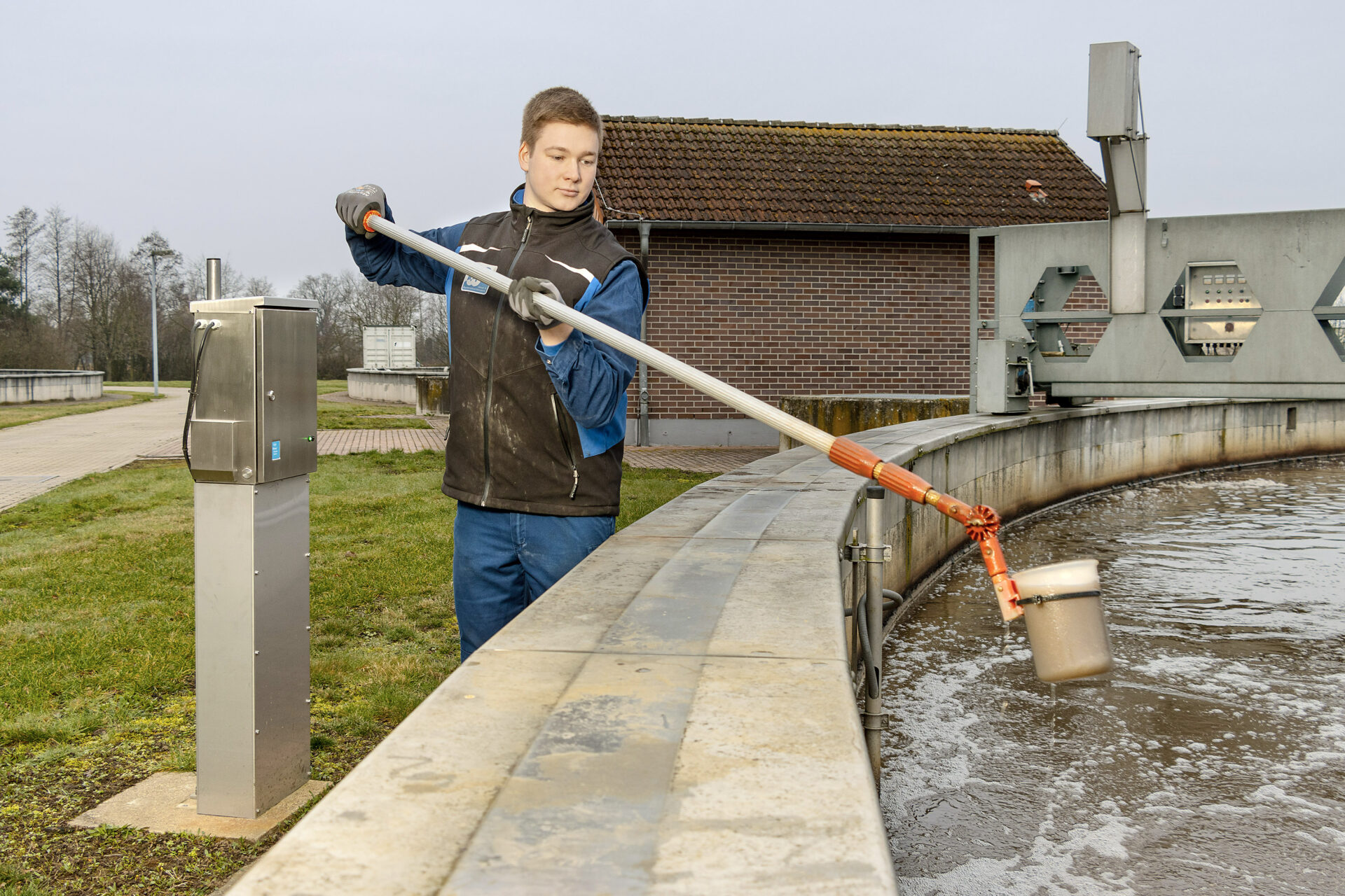 Die morgendliche Probenahme im Belebungsbecken ist für Ricci Timm mittlerweile Routine.