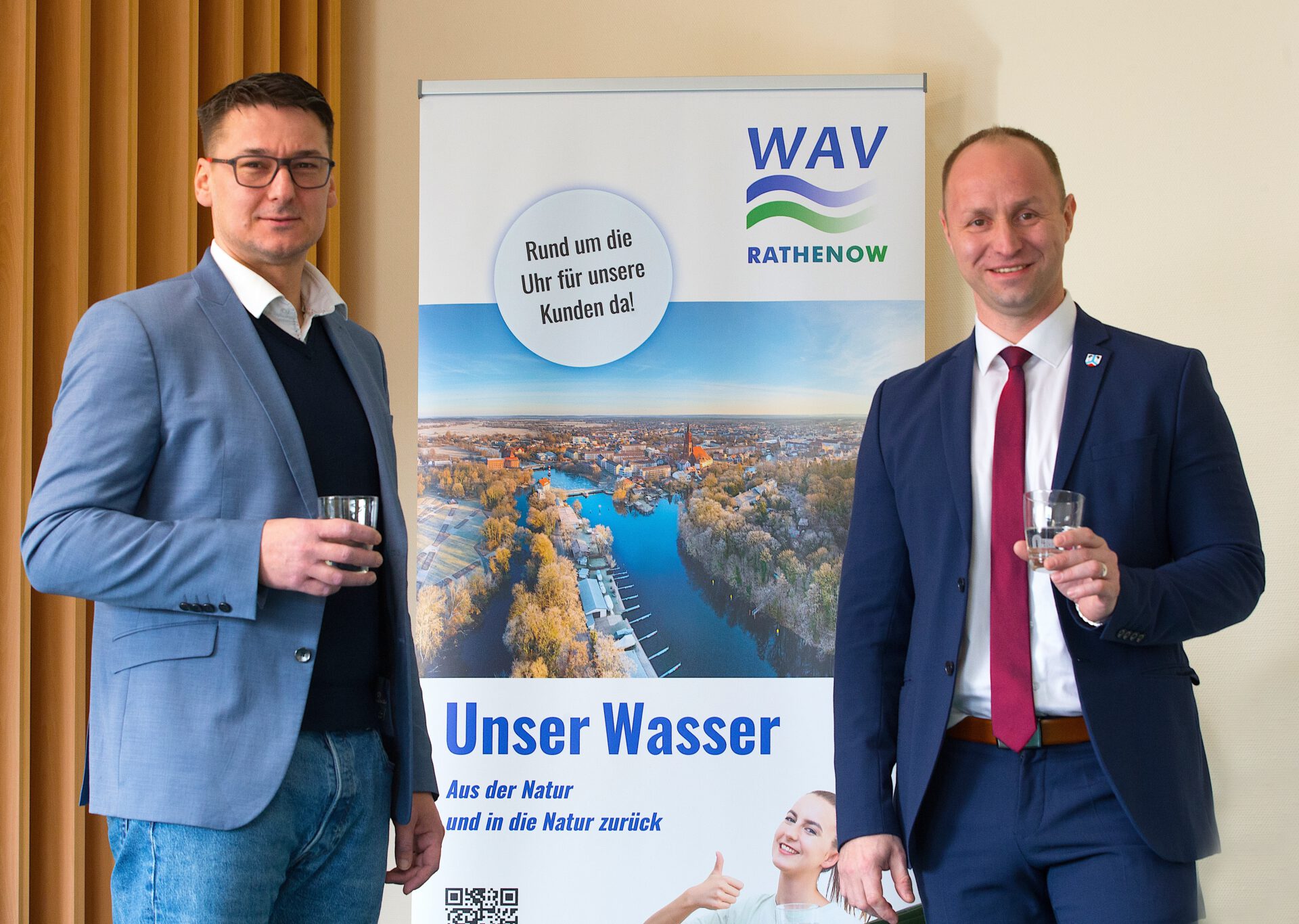 WAV-Geschäftsführer Björn Jelinski (li.) und Verbandsvorsteher Felix Menzel stoßen symbolisch mit einem Glas Wasser an.