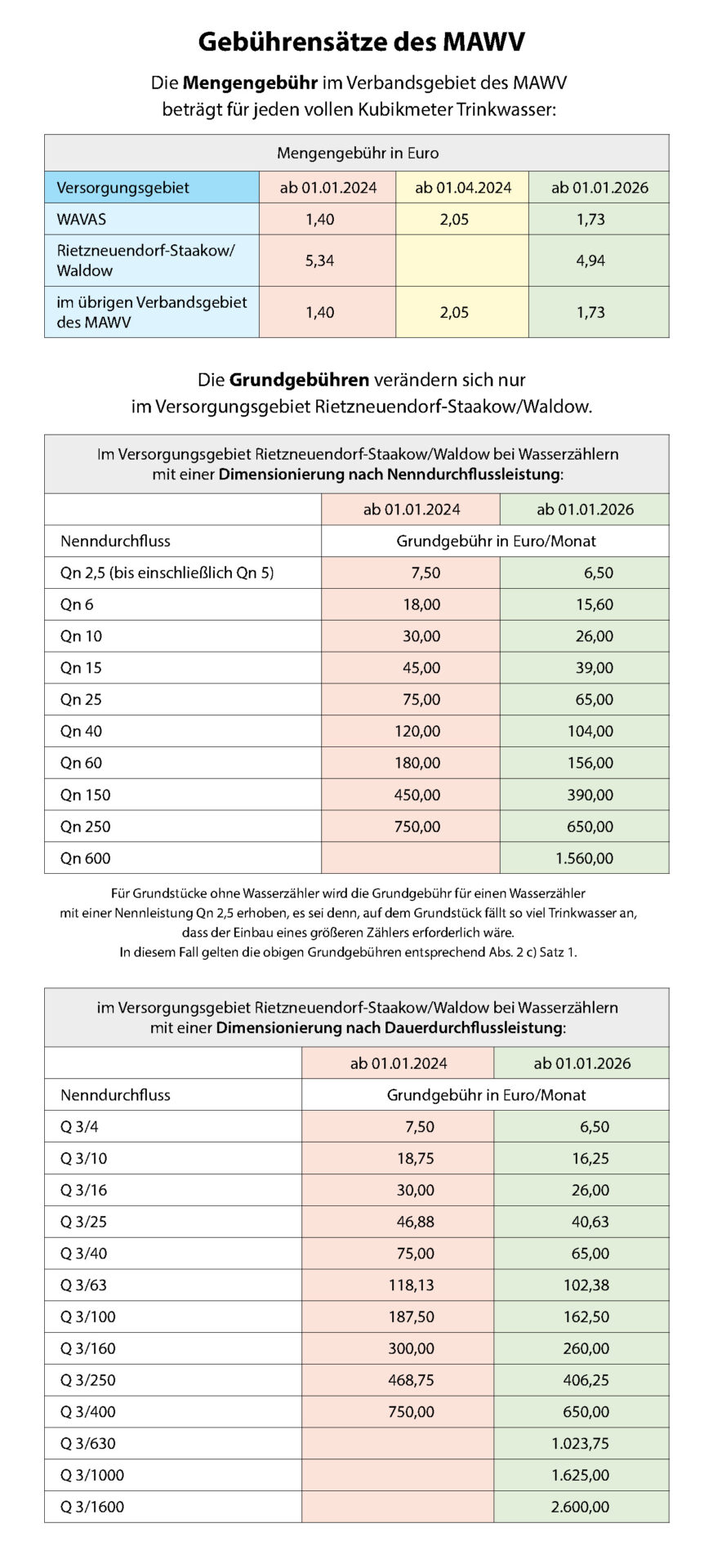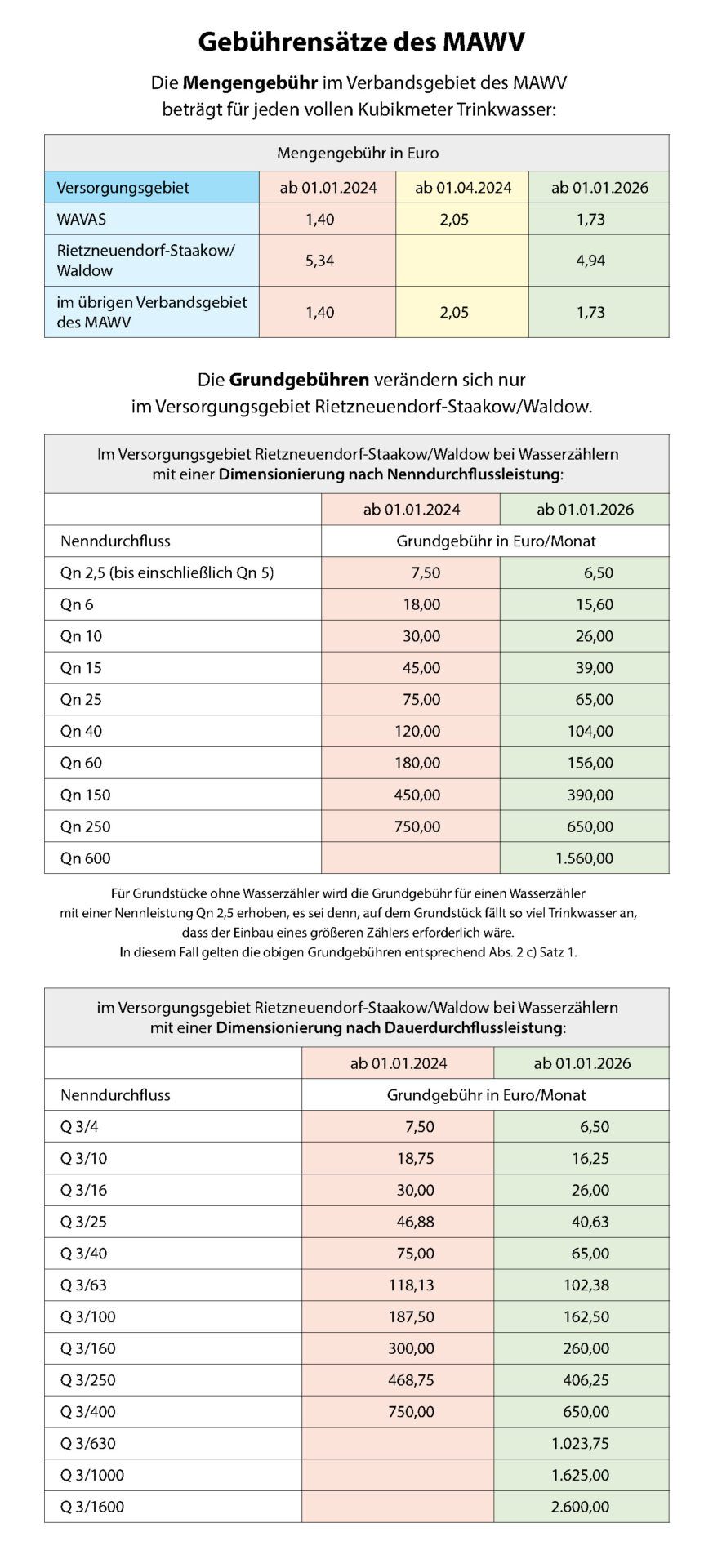 Auch im Versorgungsgebiet Rietzneuendorf-Staakow/Waldow werden die Trinkwasserpreise ab 2026 gesenkt – von 5,34 Euro auf 4,94 Euro pro Kubikmeter. In diesem Bereich ist die Entwicklung zusätzlich durch die Trinkwasserbeitragserhebung erklärbar. Die von den Kundinnen und Kunden gezahlten Beiträge zur zentralen Trinkwasseranlage wirken sich entlastend auf die Gebührenkalkulation aus. Parallel dazu werden die monatlichen Grundgebühren moderat reduziert, etwa bei Wasserzählern mit kleiner Nenndurchflussleistung von 7,50 Euro auf 6,50 Euro.