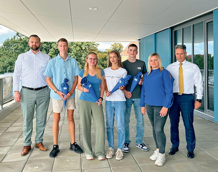 Zum Ausbildungsbeginn am 1. September begrüßte der Betriebsführer des Wasserverbandes Lausitz fünf neue Auszubildende: die angehenden Industriekaufleute Natalia Staruzyk (nicht im Bild), Jessica Alex und Pauline Jähnig sowie die beiden künftigen Anlagenmechaniker Jonas Robisch und Florian Philipp. Ein besonderes Detail gehört dabei längst zur Tradition: „Um den Start in die berufliche Zukunft zu versüßen, gab es für das Quintett natürlich wieder unsere Zuckertüten“, verrät die Jugend- und Auszubildendenvertretung Julina Felsch. Ebenso fest etabliert ist das erste Zusammentreffen mit den bereits im Unternehmen tätigen Auszubildenden – ein wichtiger Baustein, um von Beginn an Teil der Gemeinschaft zu sein. Begleitet wurde der Auftakt von den Geschäftsführern Patrick Laurisch und Thomas Schiller sowie Ausbilderin Jessica Quasnitschka. Schließlich soll er der Auftakt eines langen, chancenreichen Berufslebens bei WAL-Betrieb sein.