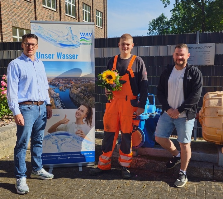 Iven Jahn hatte sich 2022 auf den Ausbildungsplatz als Fachkraft für Wasserversorgungstechnik beworben und wurde der neunte Auszubildende seit Gründung des WAV Rathenow. Nach dreieinhalb Jahren hat er seine Ausbildung abgeschlossen und ist nach bestandener Prüfung Umwelttechnologe für Wasserversorgung. Als solcher wurde er vorerst für ein Jahr vom WAV übernommen, wozu ihm Geschäftsführer Björn Jelinski und der Leiter Trinkwasserversorgung, Felix Püschel, persönlich gratulierten.