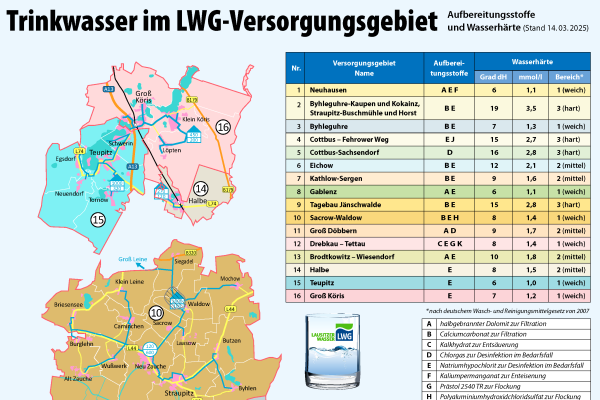 Entnehmen Sie unserer Übersichtskarte die verwendeten Aufbereitungsstoffe und die gelieferte Wasserhärte.