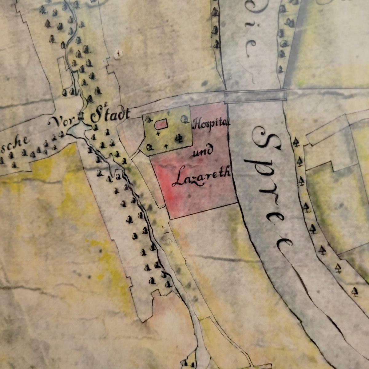 Die Kombination aus Hospital und Lazareth bildete mit dem Friedhof einen gemeinsamen Komplex – direkt hinter der damaligen Stadtgrenze an der Spree.