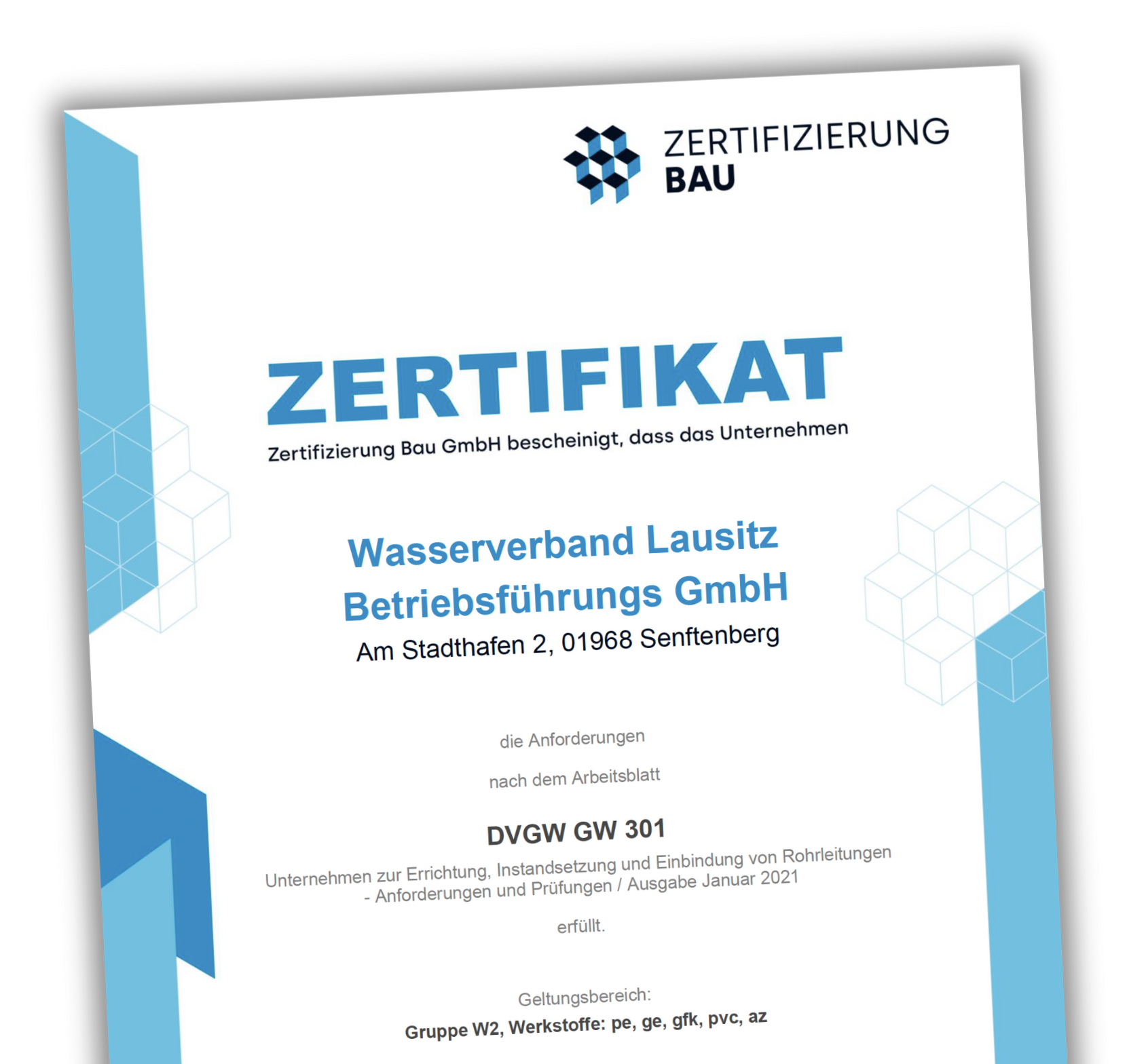 Hinter dem Kürzel „DVGW GW 301“ verbirgt sich die Zertifizierung zur Errichtung, Instandsetzung und Einbindung von Rohrleitungen.